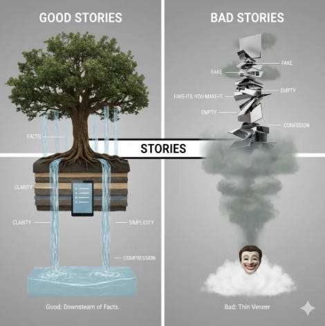 One was storytelling as veneer. The other was storytelling as compression of hard-won insight.